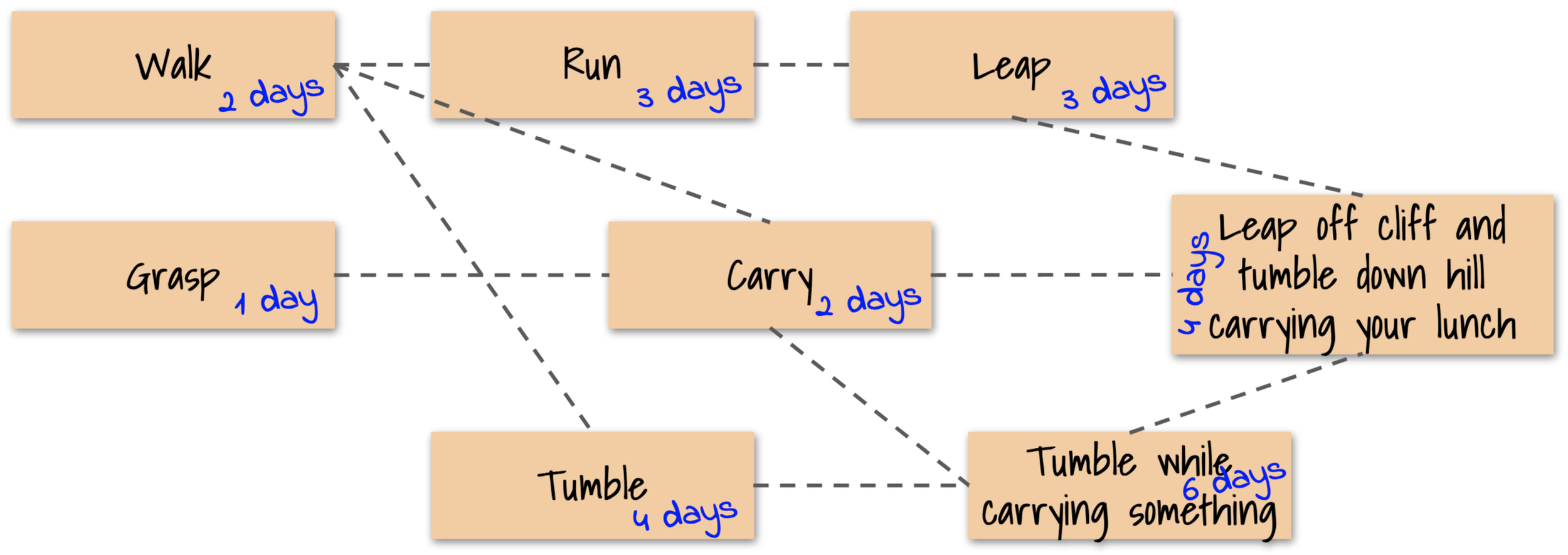 The longest of these is path 4, Walk —> Tumble —> Tumble While Carrying Something. Thus, no matter how fast other capabilities are completed, the time to create the final usable or marketable capability, Leap Off Cliff and Tumble Down Hill While Carrying Your Lunch, is constrained to be no sooner than 12 days. That is the critical path.